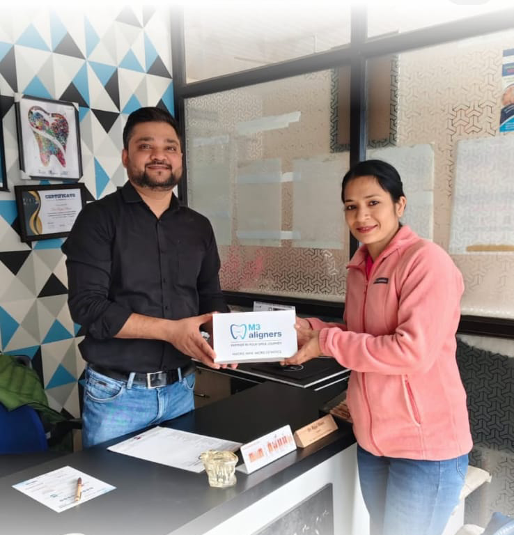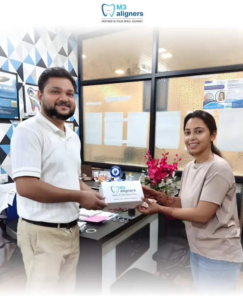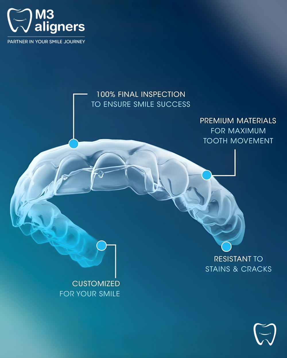 M3 aligners are custom clear trays that gradually move your teeth into the correct position.